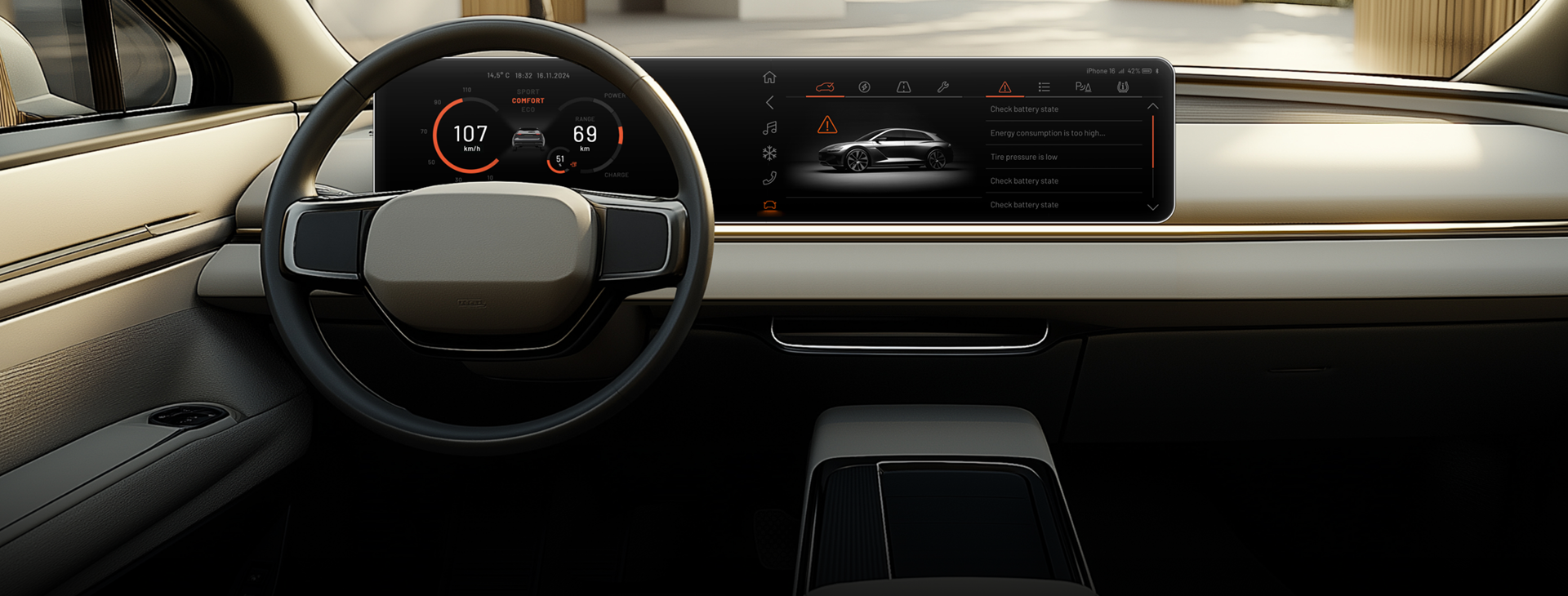 Das Produktdesign im Fahrzeuginnenraum spielt eine entscheidende Rolle für die Benutzererfahrung und die Funktionalität moderner Fahrzeuge. Unsere Dienstleistungen umfassen das Produktdesign für Infotainmentsysteme, digitale Kombiinstrumente und die Gestaltung von Bedienelementen wie Multifunktionstasten, Schaltern oder Reglern im Kontext der Infotainment- oder Klima- oder Navigations-funktionen. Wir beteiligen uns an der Entwicklung des Housings und an der Integration von Multimediaschnittschellen, wie z.B. AUX, USB oder Wireless Charger und Anschluss-möglichkeiten für Apple CarPlay und Android Auto.